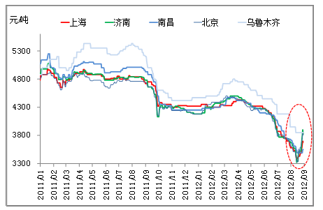 價(jià)格差異較大與各城市間本來的價(jià)格水平也不無關(guān)系,烏魯木齊由于地理位置較為偏遠(yuǎn),運(yùn)輸不便,市場相對較為封閉,大多數(shù)時(shí)間,當(dāng)?shù)氐膬r(jià)格水平相對較高,因此,在其他市場普遍上漲的情況下,它的價(jià)格依然處于高位,上漲動力不足。而上漲幅度較大的濟(jì)南、廣州、北京等市場大多價(jià)格水平本來不高,而且前期出現(xiàn)了較大的跌幅,鋼聯(lián)云終端因此存在補(bǔ)漲的需要。