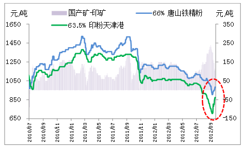 進(jìn)口礦與國產(chǎn)礦同樣表現(xiàn)迥異。今年7月以來,進(jìn)口礦呈現(xiàn)加速下跌態(tài)勢,一度跌至9月初的88美元/噸,跌幅達(dá)24.1%。受QE3和國內(nèi)利好消息影響,在短短一周內(nèi)又迅速反彈14.2%,達(dá)到112.5美元/噸。而國產(chǎn)礦的跌幅相對較小,本輪下跌跌幅為19.5%,9月9日開始的反彈幅度為9.17%,明顯小于進(jìn)口礦(如圖4所示)。究其原因,主要是由于今年自進(jìn)口礦出現(xiàn)暴跌以來,內(nèi)外礦價(jià)差由最大時(shí)的250元/噸左右縮小到目前的105元/噸左右,進(jìn)口礦的價(jià)格優(yōu)勢愈發(fā)明顯,很多國內(nèi)企業(yè)更傾向于使用進(jìn)口礦,導(dǎo)致外礦配比高企,甚至一度達(dá)到了93%的歷史高位。另一方面,國內(nèi)礦山由于生產(chǎn)成本較高,很快跌破邊際成本,大幅的虧損導(dǎo)致國內(nèi)部分礦山陷入停產(chǎn),內(nèi)礦價(jià)格也逐漸趨于穩(wěn)定。