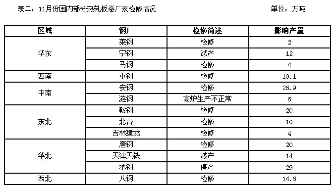 據調查的38家生產企業的64條熱軋線生產線來看,正常月產能為1636.26萬噸,9月份計劃產量1277.12萬噸,達產率78.1%,環比減少3.9%,因檢修影響的產量為184.46萬噸。而到11月份,64條產線中14條產線檢修或減產,影響產量172.6萬噸,戰總產量的10.3%。