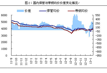 基于元旦之后鋼市整體迎來小波拉漲高潮,但是成本高位持續性支撐偏差,導致本周紛紛回落;國內管坯市場均價從上周的4057元/噸漲至4121元/噸,累計漲幅為64元/噸,漲幅基本與上周持平,雖然本周坯料略有回落,但是管坯依舊堅挺,部分因資源缺乏,呈現小幅拉漲之勢。國內無縫管市場均價從上周的4588元/噸漲到4607元/噸,漲幅為19元/噸;而兩者的盈利也由759元/噸漲至814元/噸,漲幅為55元/噸。國內焊管市場均價上周的4077元/噸跌至4002元/噸,累計跌幅為75元/噸;原料帶鋼均價從上周的3863元/噸降至3798元/噸,累計降幅65元/噸;而兩者的盈利由243元/噸降到226元/噸。在帶鋼逐步降低的同時,主流管廠紛紛跟跌,下調的意愿雖不強烈,但是迫于成本壓力,依舊保持了一定的跌幅。